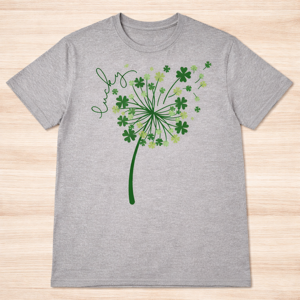 Soft, simple, and full of charm — this lucky tee features a whimsical shamrock dandelion design that looks like it’s blowing good fortune wherever you go. With multiple shades of green and a delicate script detail, it’s the perfect mix of festive and everyday wearable.