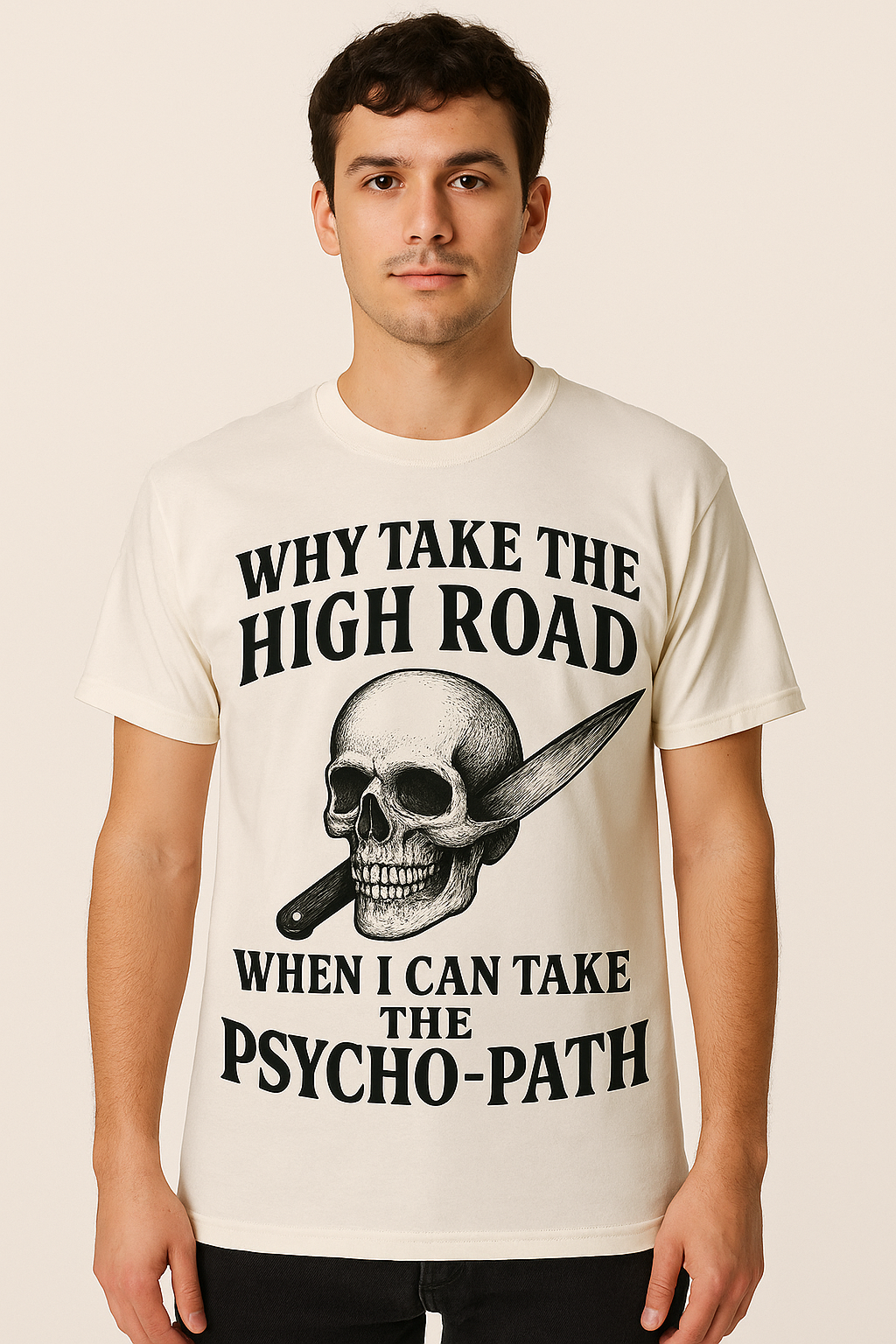 Why take the high road when the psycho path has better scenery, fewer rules, and a lot more laughs? This shirt is perfect for the drama-dodgers, chaos-lovers, and certified side-eye experts. Wear it when you’re feeling cute, unbothered, and one sarcastic comment away from a full-blown villain era.